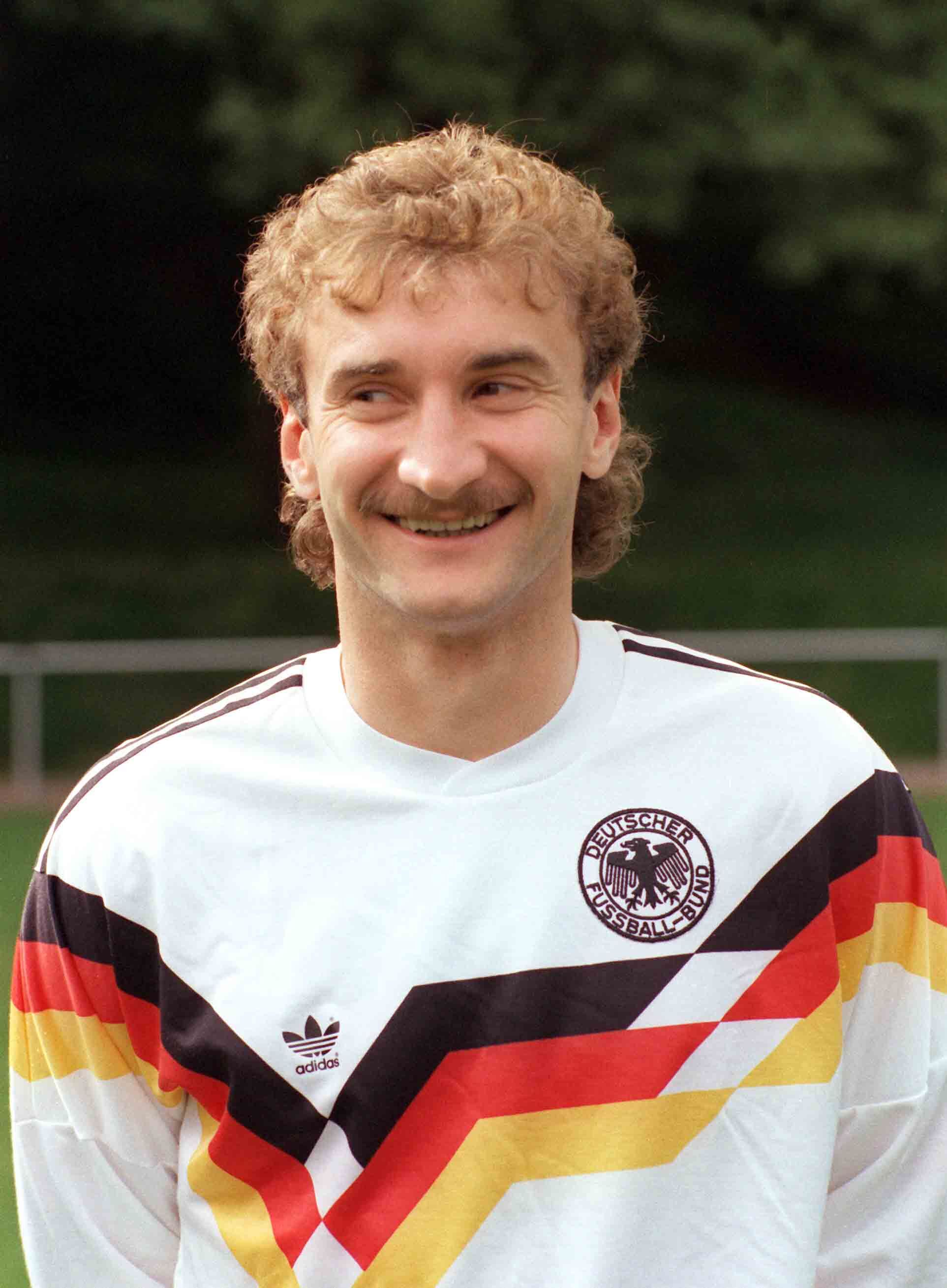 Voll, voller, Völler zeigt sich die voluminöse Frisur des deutschen Stürmers Rudi Völler. Dauerwelle mit Vokuhila-Ansätzen und Oberlippenbart. Dieser Look hatte in den 80ern sein absolutes Hoch. Und vermutlich wird das auch so bleiben.
