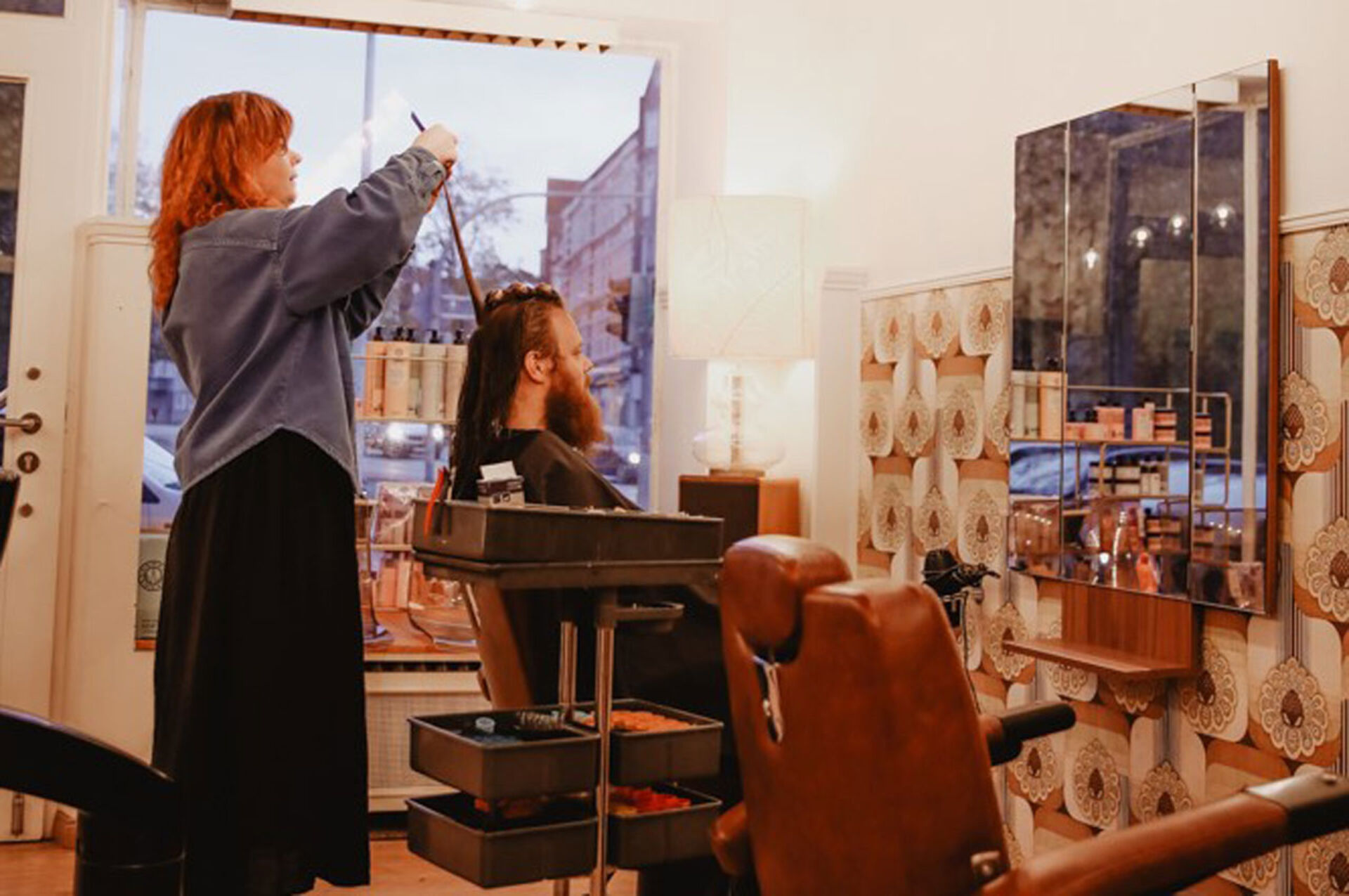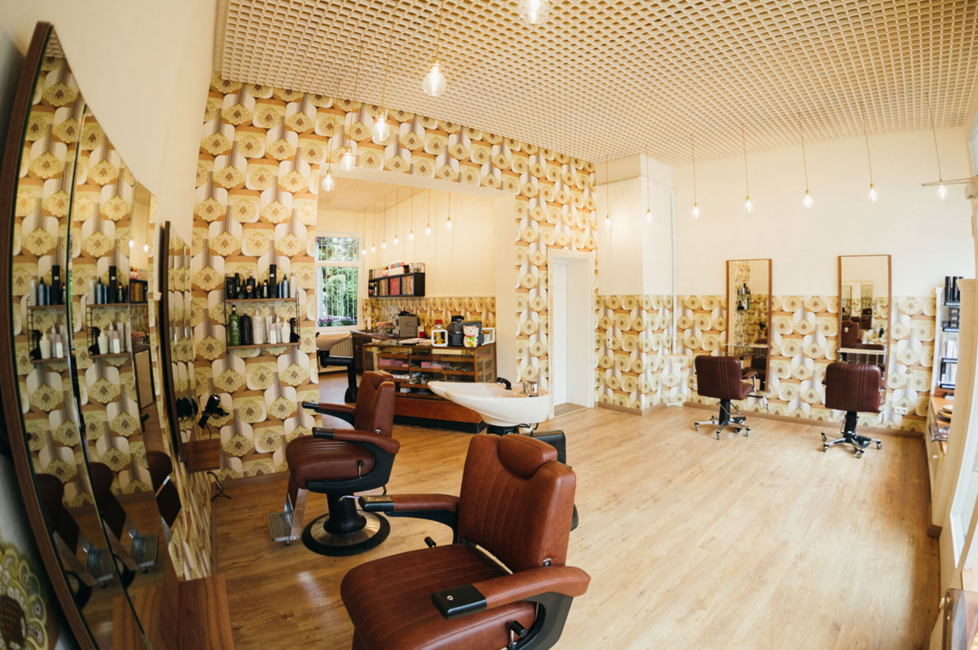 Die Kieler "Frisierstube" bringt absolute Nostalgie-Atmosphäre, verantwortlich dafür sind die Retro-Wandtapeten, die aus dem Entstehungsjahr des Salon-Gebäudes stammt. Erdtöne dominieren und wärmen den Raum. Damit der Raum nicht zu voll wirkt, wurde die Raumgestaltung gekonnt mit viel Licht inszeniert. Die Deckenleuchten sind modern und minimalistisch eingesetzt. Diese Kombination aus Retro-Eyecatchern und reduzierten Elementen lässt den Laden aufgeräumt und nicht zu überladen wirken. Genauso spart das zentrale Waschbassin Raum.