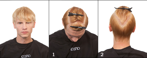 1|2 An den schwächsten Punkten der Kontur beginnend max. 4cm tief, eine elypsenförmige Abteilung vornehmen um den Ponybereich zu sektionieren. Hinter der Ponysektion beginnend bis 2 cm oberhalb des Hinterhauptbeines eine längliche Dreiecksform abteilen.