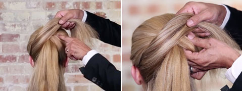 Step 3| Das Passé von der gegenüberliegenden Seite des Pferdeschwanzes mit zwei Fingern greifen und das Passé der anderen Seite mittig durch den Zopf geben, mit den Fingern von untern greifen und straff durchziehen. Mit einer Haarnadel fixieren.