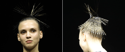 Step 2 | Angelo Seminara hat das Haarband, für den Stachel-Look vorher präpariert. Im nassen Zusand wird es gewachst und noch nass mit 20 Schichten Haarlack besprüht.