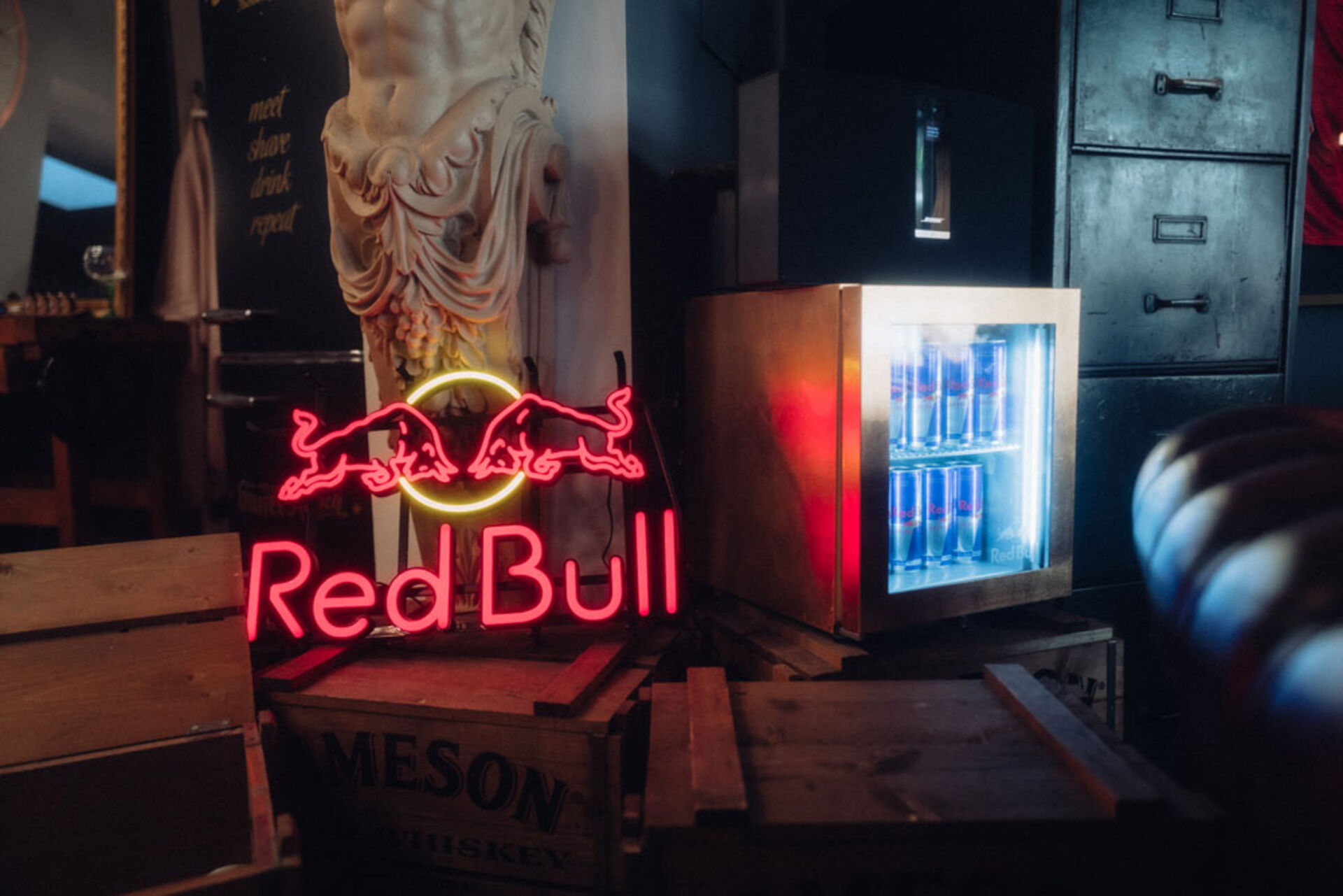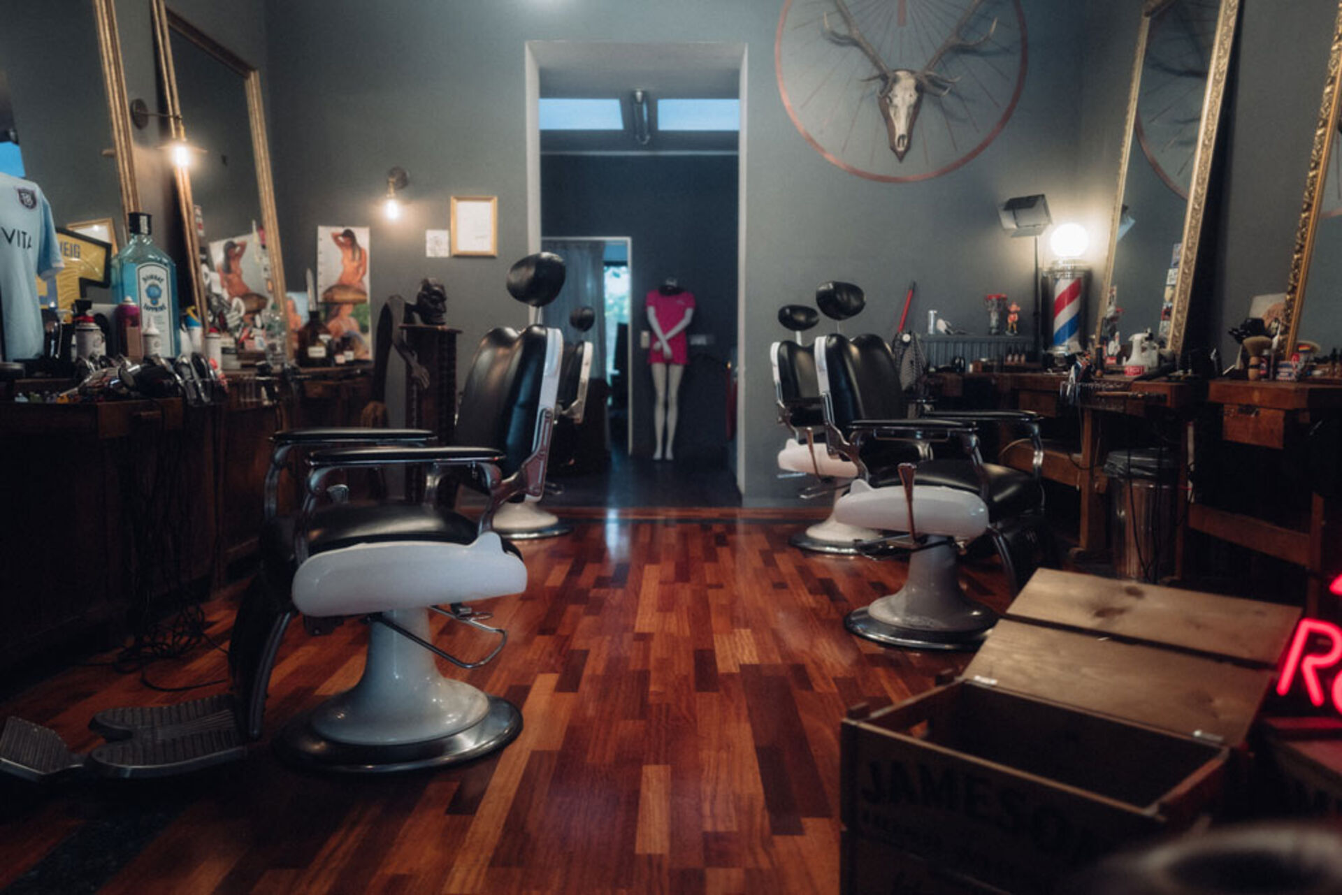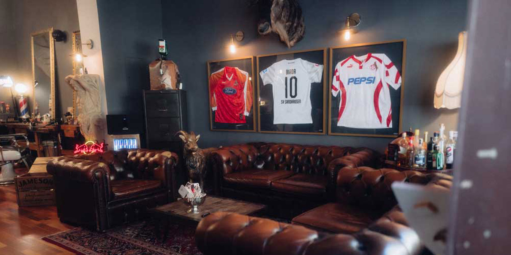 Der unglaublich coole Salon gleicht einem Club: Redbull Dosen in Minikühlschränken, Jägermeister Zapfsäulen und diverse andere Spirituosen sind im GBC überall verteilt. Der Laden ist stilvoll dunkel gehalten - braune, graue und schwarze Wände und die Einrichtung im Retro-kolonial Stil ähneln sehr einem historischen Filmset - nur cooler. Die Chesterfield-Sofas, die eleganten Lampen und große Perserteppiche kreieren den Vintage Club Look. Goldene Spiegel auf Holzkommoden und komfortable Barber Stühle in Schwarz-weiß und Vintage Look fügen sich perfekt in das Interieur-Konzept mit Club Charakter. Die Friseurgeräte ragen aus den offenen Schubladen der Kommode – chaotisch also wie in einem großen Jungs Zimmer, aber gemütlich und inklusive Stormtrooper im Anzug im Wartebereich. Zum Teil arbeiten die Barber mit eigenen Produktentwicklungen, mit der Ware von Reuzel und den Maschinen von Wahl.