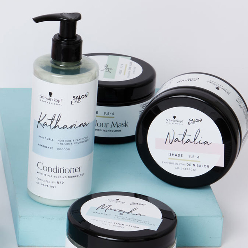 Komplexe Pflege, einfaches Konzept: nach einer Haaranalyse bei der Friseur*in können Kund*innen personalisierte SalonLab&Me Produktpakete mit Shampoo, Conditioner und Maske im salonexklusiven Onlineshop bestellen. Die in den Paketen enthaltenen Produkte wenden verschiedene Technologien an, darunter die innovative Triple-Bonding-Technologie.