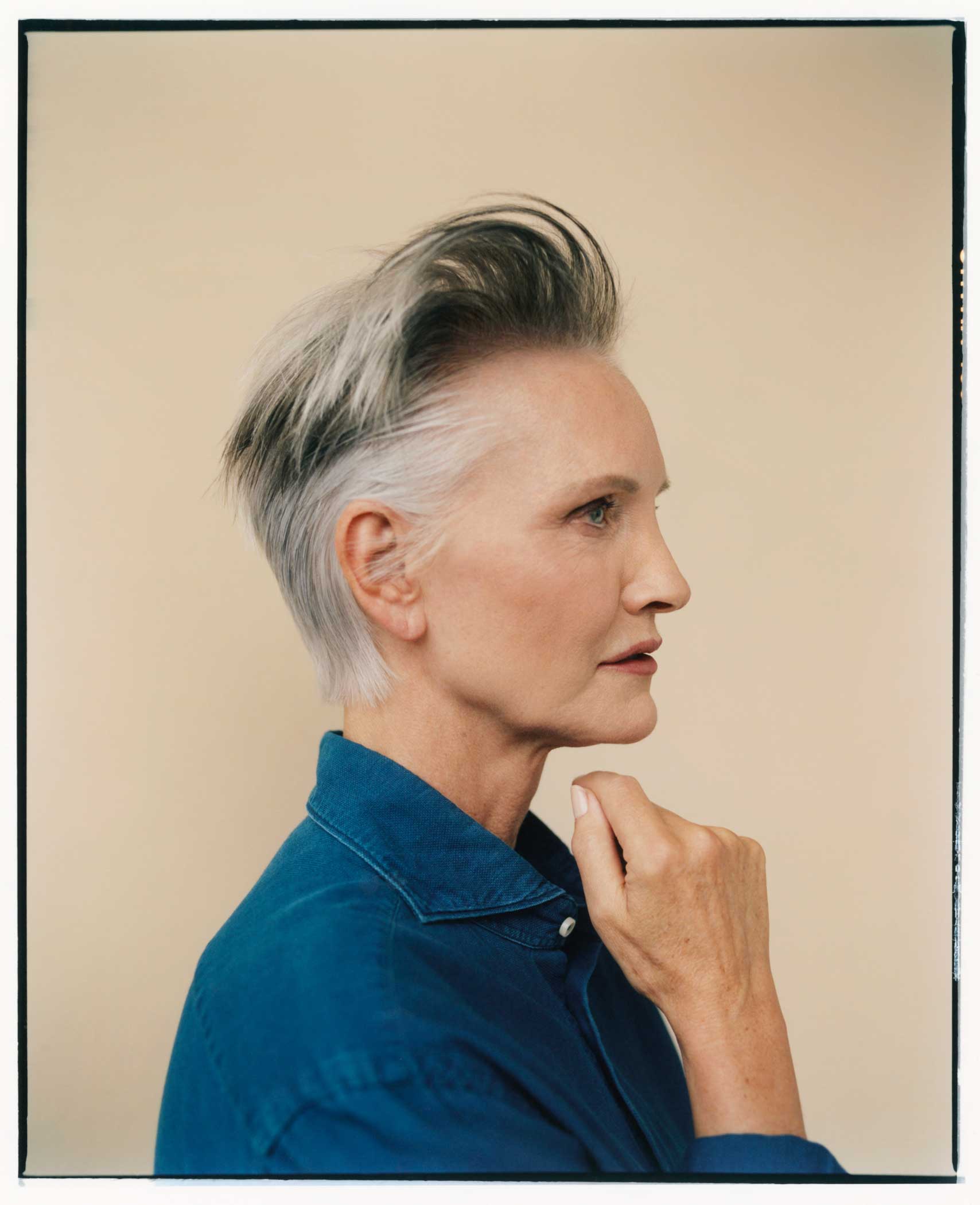 Die Herausforderung bei der Pflege von grauem Haar, sowohl natürlichem als auch gefärbtem, sind warme Reflexe. Tom Conell setzt dafür auf die Verwendung der Davines Mask with Vibrachrom Natural Intense Cold, um einen attraktiven kalten Grauton zu erzielen. Zur anschließenden Pflege nutzt er Alchemic Shampoo Silver mit blau-violetten Pigmenten.