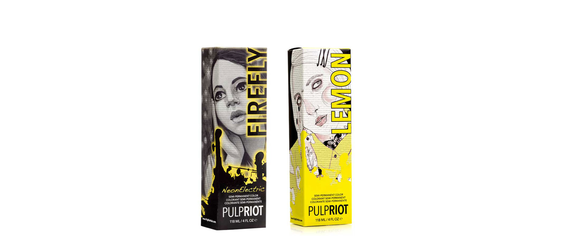 Pulp Riot  zieht schon allein mit dem Verpackungsdesign alle Blicke auf sich. Die Semi-Permanent Haarfarben Lemon und Neon Electric Firefly zeigen, was Styles in Gelb können. Mit Neon Electric Firefly verleiht dem Look unter Schwarzlicht einen Special Effekt und lässt die Haare in Neon erstrahlen.