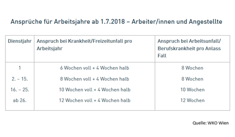 Für Lehrjahre ab dem 1.7.2018 kommt es nun zur Verdoppelung des Anspruches. Somit haben Lehrlinge ab diesem Zeitpunkt einen Anspruch auf ein Krankenentgelt für 8 Wochen in der Höhe der vollen Lehrlingsentschädigung und einen Folgeanspruch für 4 Wochen auf Teilentgelt pro Lehrjahr.