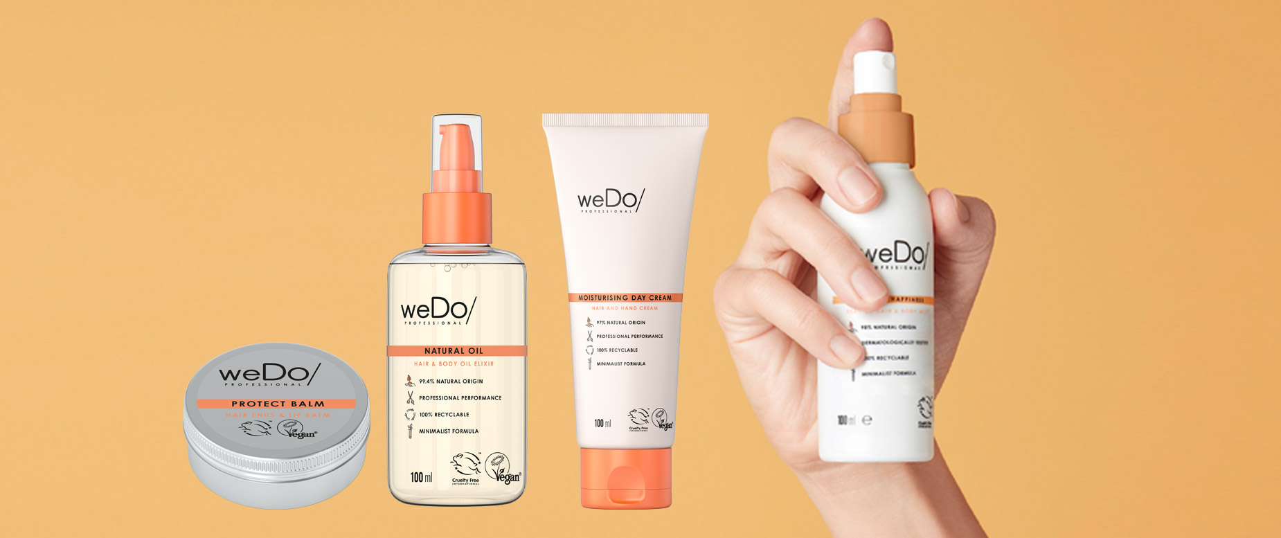 Sofortpflege, die in jede Handtasche passt, gibt es von der veganen Marke weDo. Mit vier praktischen 2-in-1-Produkten (Öl, Creme, Spray und Balm zu je 100 ml) können Haut und Haar jederzeit gepflegt werden.
