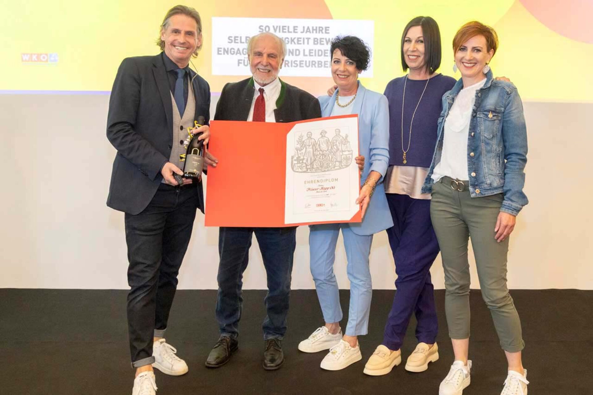 Alljährliches Highlight des Frühlingsfestes ist die Ehrung langjähriger Friseurunternehmerinnen und Unternehmer, die gewohnt vor den Vorhang geholt wurden: Martha Leis und Gisela Zimmermann wurden für 25 Jahre, Sandra Aigner-Fössinger, Marianne Floriani, Waltraud Schober und Hermann Troger für 30 Jahre geehrt. Silvia Junker und Magdalena Rieder blicken auf 35 Jahre und Romanus Münch auf 40 Jahre Selbstständigkeit zurück, Markus Paradisch und seine Mutter auf 50 Jahre. Und Werner Degler wurde für beachtliche 90 Jahre Selbständigkeit gewürdigt!