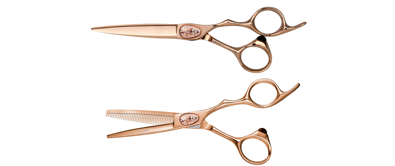 Die e-kwip+ Primus 55 Pink Gold Haarschere und eine goldene e-kwip+ Primus Pink Gold 40 Modellierschere von Haaro haben eine goldene Titanbeschichtung.