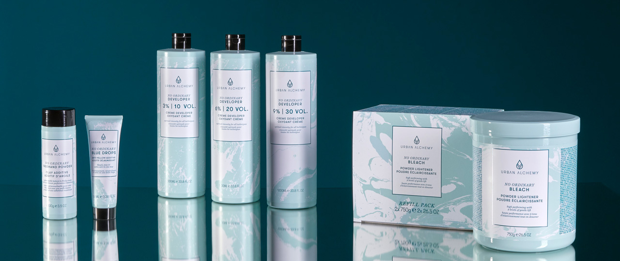 Beyond Blonde von Urban Alchemy aus dem Hause New Flag beinhaltet Produkte zum Blondieren, Abmattieren und Pflegen in nur einem Schritt. Die Produkte bieten bis zu 9 Stufen schonende Aufhellung und maximale Kontrolle der Viskosität.