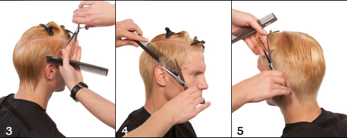 3|4 Mit nach hinten verlaufend diagonalen Passeés in einer gleichmäßigen Stufung arbeiten. Die Konturen werden mit der Technik "Schere über Kamm" (Fasson) ausgearbeitet.