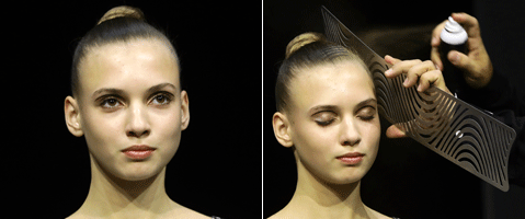 Step 1 | Den strengen Dutt von allen Seiten mit dem "Imprinter" in einer Farbe Ihrer Wahl, hier Gold, besprühen.