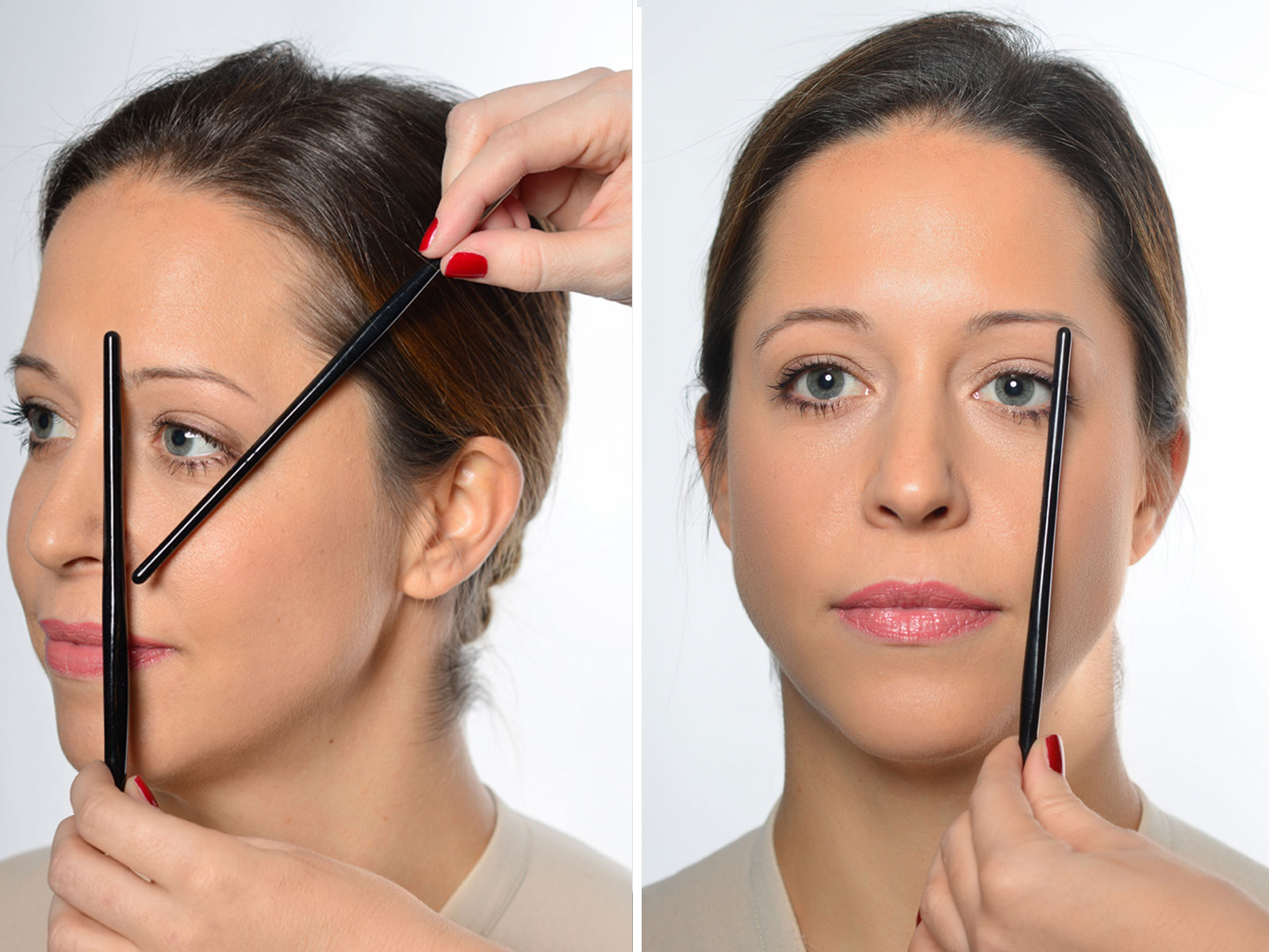 Step 1| Die Augenbrauen der Kundin ausmessen und die Gesichtsform analysieren.
