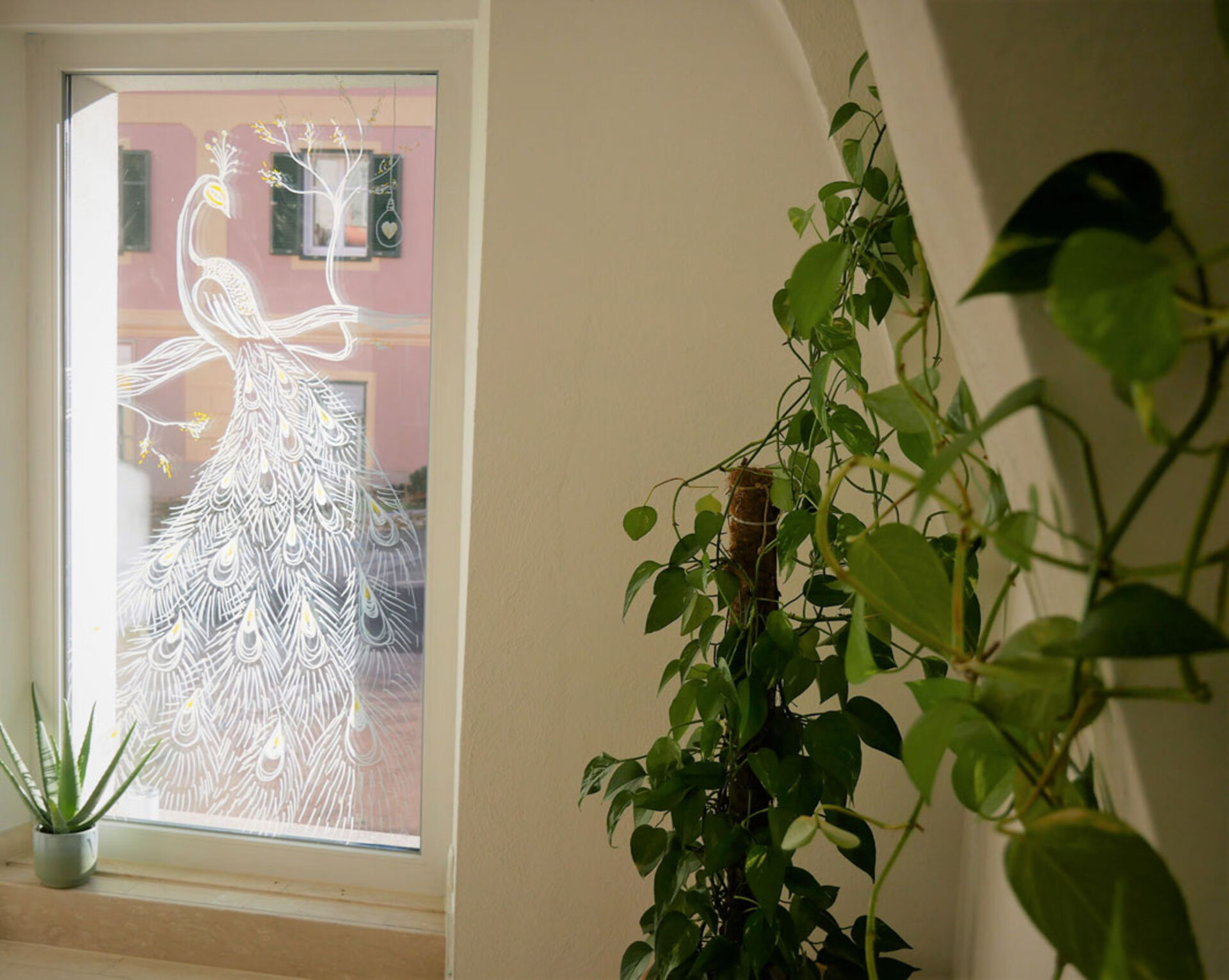 Angenehm ist auch der Waschbereich gestaltet: Platziert im wunderschönen historischen Gewölbe lädt dieser zum Ankommen ein. Mit der grünen Pflanze sind Ruhe-Oase Vibes inklusive. Besonders sind die eindrucksvollen Kreidemalereien an den Schaufenstern. Salon-Inhaberin Martina Zink ist nicht nur Friseurin, sondern auch Künstlerin. Sie erstellt die Glasmalerei selbst und erneuert die Kunstwerke regelmäßig, den Jahreszeiten angepasst.