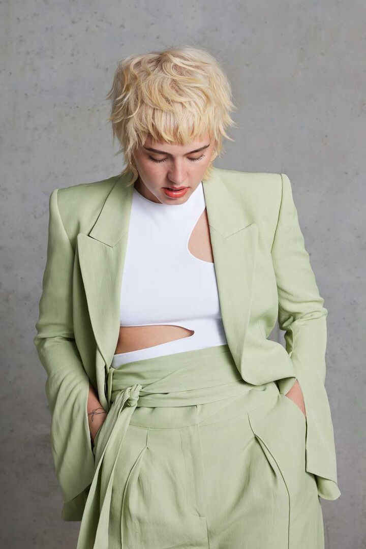 - Blond Pur: Diese Trendwelt setzt einen blonden Mullet für Modebewusste und einen sehr femininen Langhaarlook mit weich ineinanderfließenden Blondnuancen in Szene.