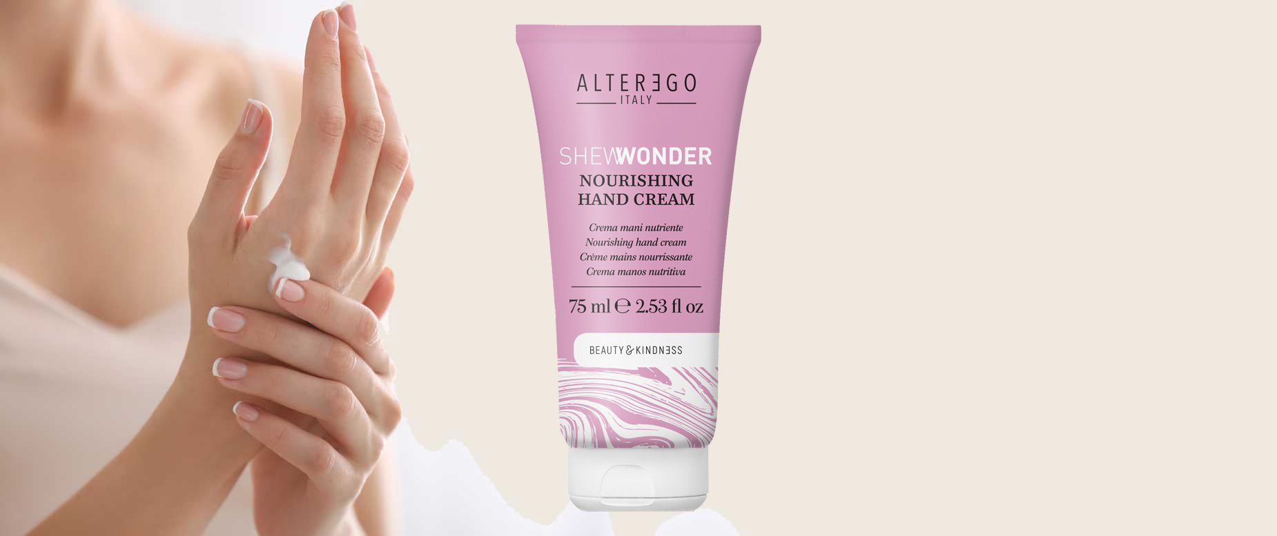 Die Handcreme von Alter Ego Italy aus der Serie SHEWONDER ergänzt das in sich geschlossene, intensive Pflegeprogramm für strapaziertes, mitteldickes, behandeltes, trockenes, krauses und widerspenstiges Haar um die schonende Pflege für die Hände. Eine sanfte und reichhaltige Creme mit weichmachender und schützender Wirkung. Die spezielle Formulierung schützt die Haut vor Trockenheit und Rissen und sorgt für langanhaltende Feuchtigkeit.