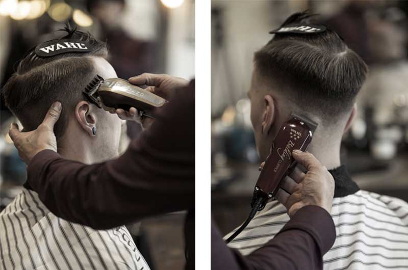 Step 3 & 4 | Mit den Aufsteckkämmen 4,5 mm bis 1,5 mm einen hautnahen Übergang im gesamten Nacken- und Seitenbereich ausarbeiten. Anschließend die Konturansätze der Nacken- und Seitenbereiche nach oben hin verlaufend ausrasieren.