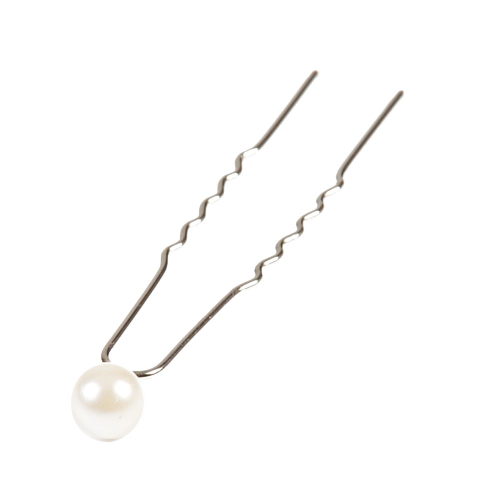 Perfekt für klassische Brautfrisuren ist diese schlicht-schöne Haarnadel (erhältlich mit schwarzer Nadel und weißer Perle oder Metallnadel und Perlmuttperle). Zu kaufen gibt Packungen mit zehn Stück in einer Größe von 5 mm x 50 mm.