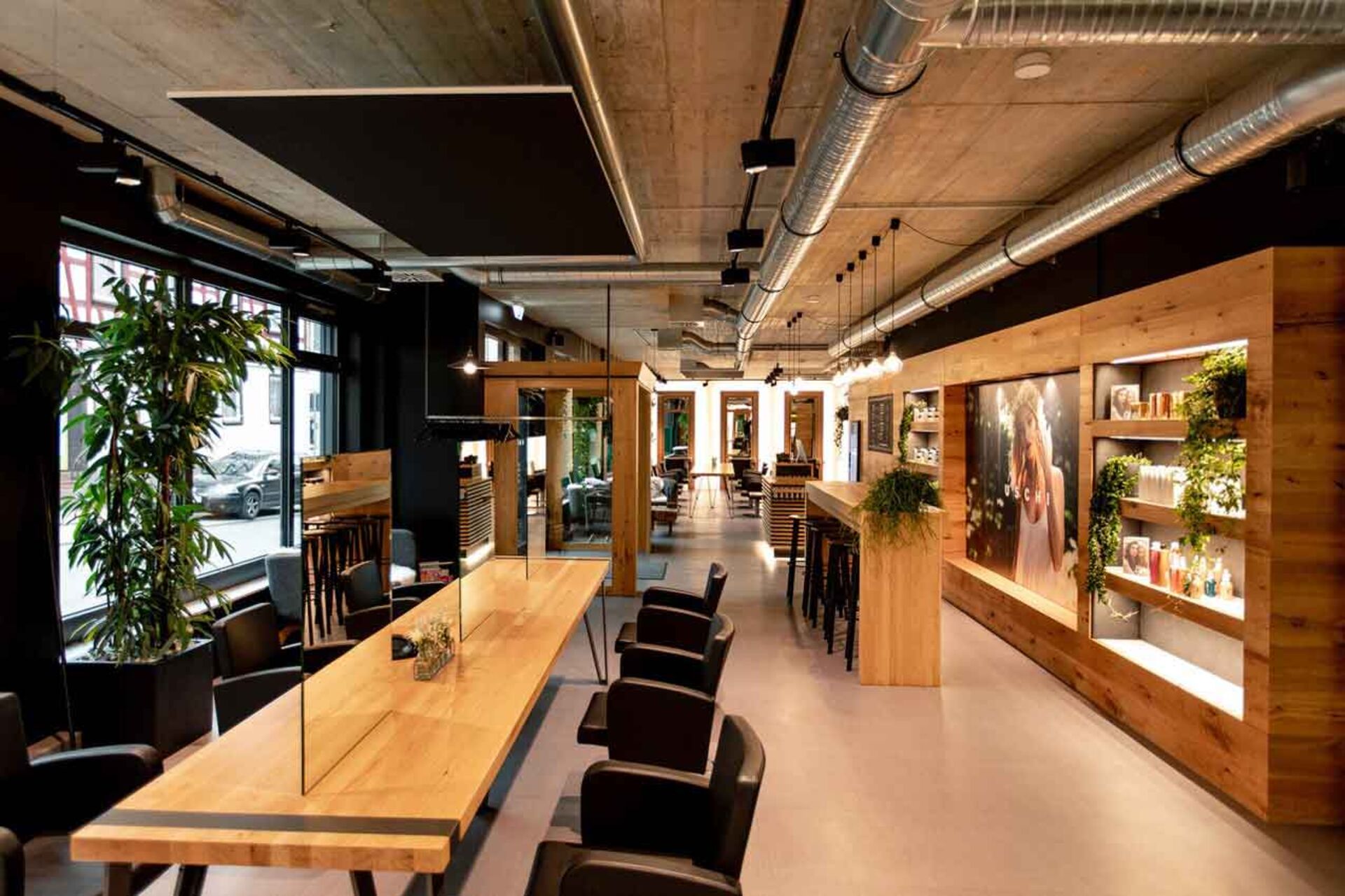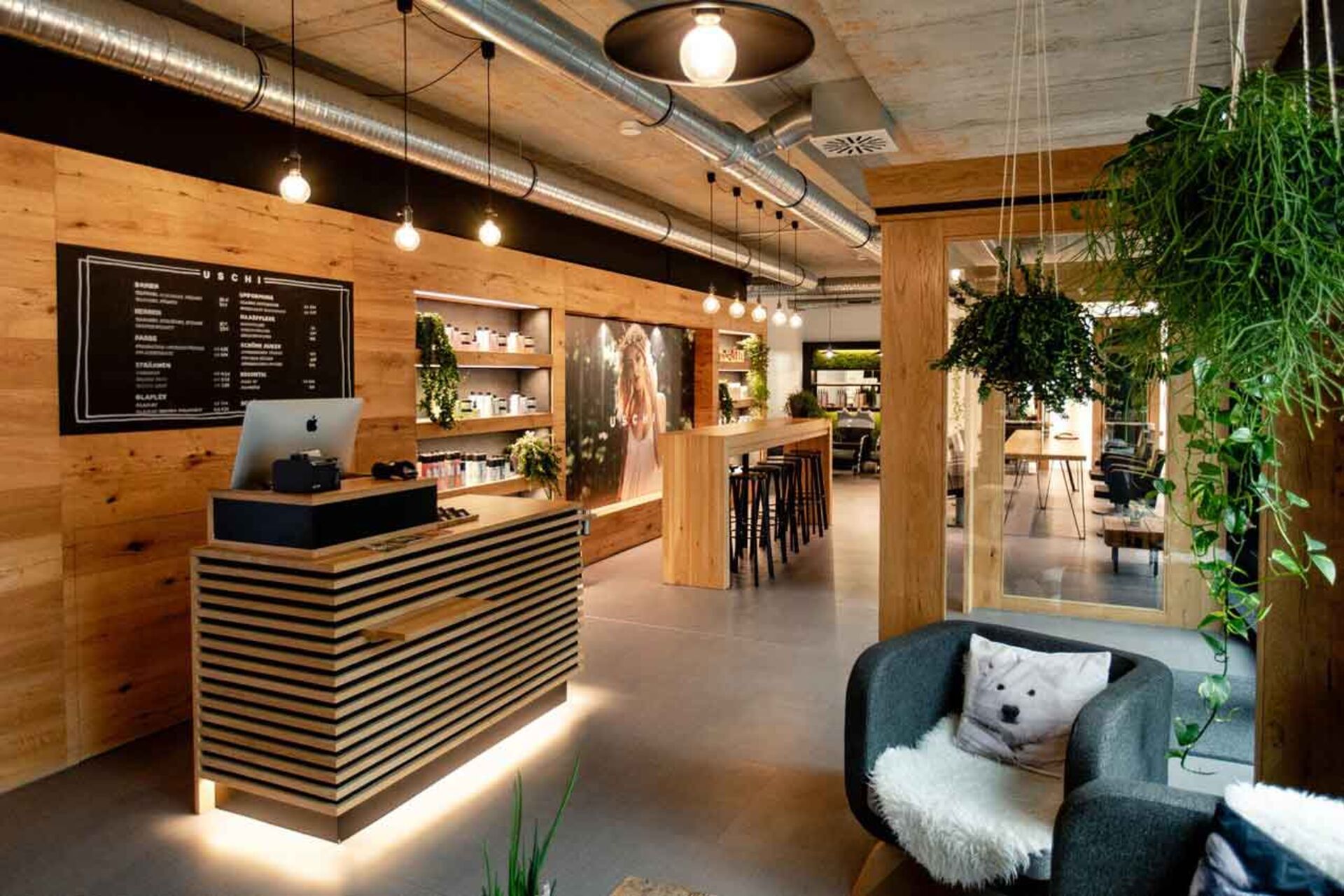 Das Mobiliar hergestellt aus natürlichen Materialien, wie z.B. aus Beton, Stahl und Holz zieren die Wände, Decken und Böden des Salons. Große Holzkästen, gefüllt mit veganen Haar-Produkten von Maria Nila und O&M, lange Frisiertische, die sich längst durch den Salon erstrecken und darüber Stahlrohre, die die Decke schmücken. Selbst die Stuhlüberzüge sind vegan.