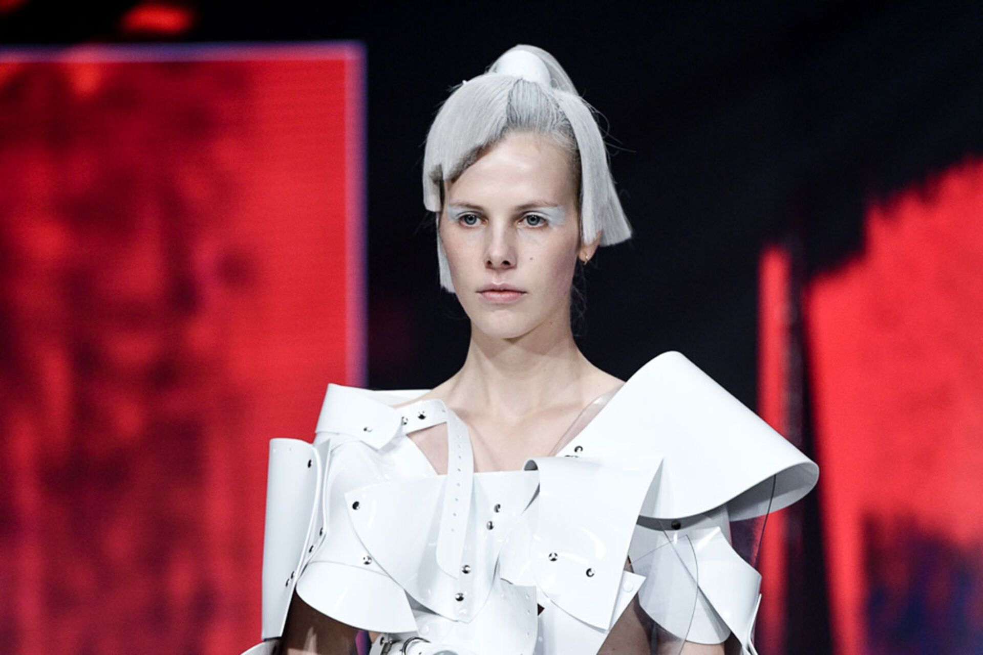 Handwerklich perfekt gearbeitete weißhaarige Perücken, in Form und Textur variierend wurden kontrastiert von Haar in schwarz und metallic Zügen.